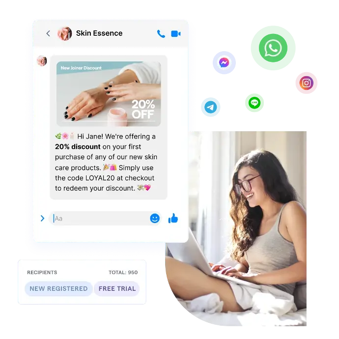 Send bulk messages to selected contacts on their favorite messaging channels. Utilize personalized WhatsApp broadcasts to boost the open rate up to 98%. Never get blocked by WhatsApp users due to irrelevant messages and excessive group chats!